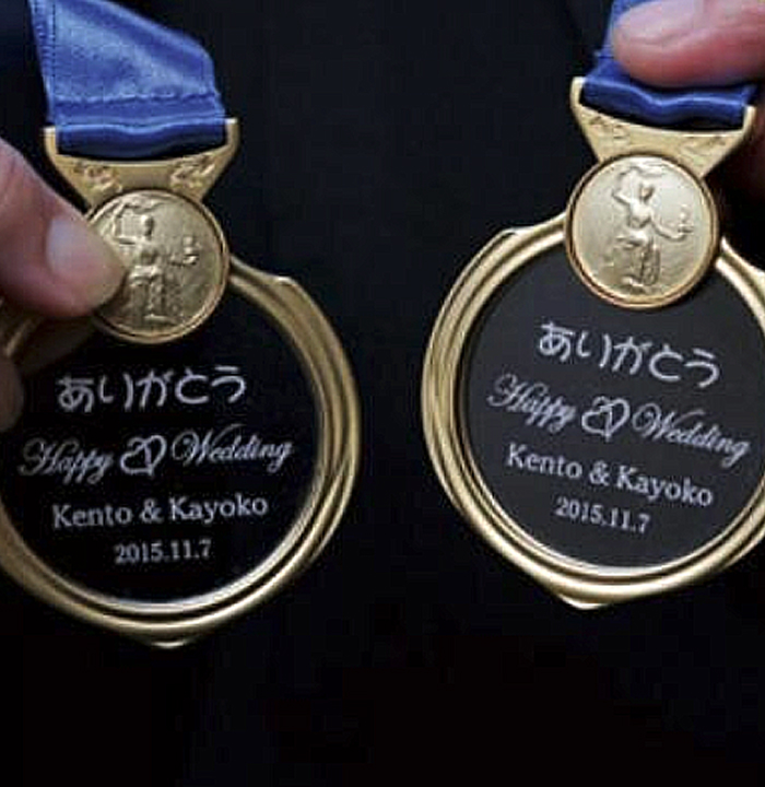 - ご両親に贈られたのはダイキャスト製メダルです。本体中央のアクリルにレーザー彫刻でオリジナルの名入れができます。ご自身の言葉で気持を贈れる商品です。